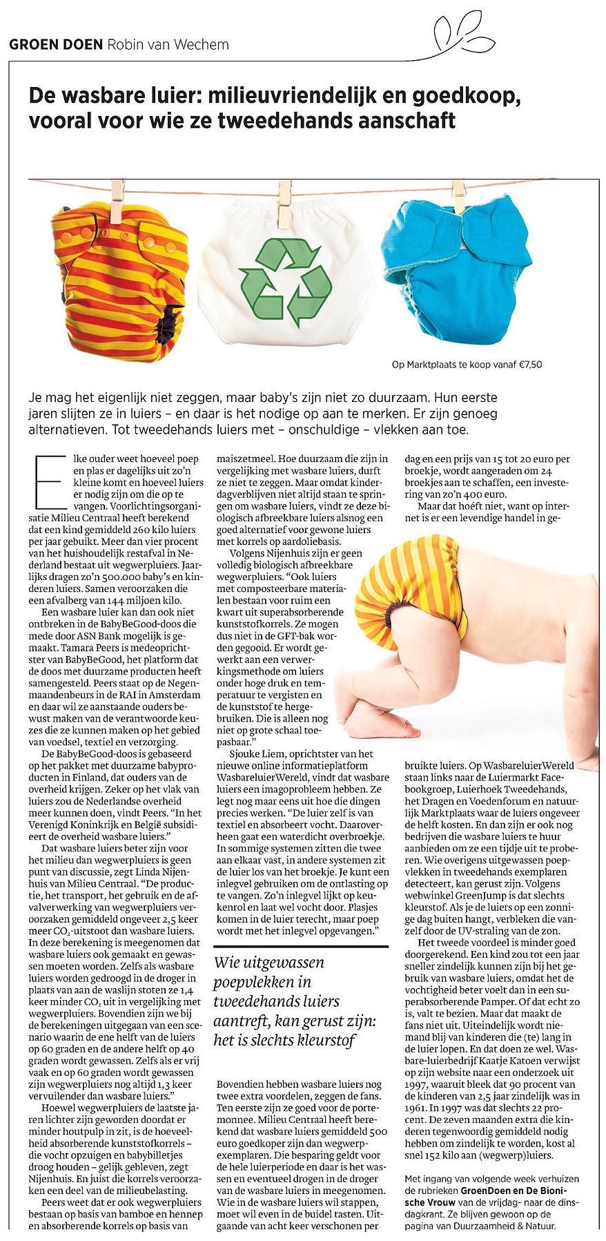 Je mag het eigenlijk niet zeggen, maar baby’s zijn niet zo duurzaam. Hun eerste jaren slijten ze in luiers - en daar is het nodige op aan te merken. Er zijn genoeg alternatieven. Tot tweedehands luiers met - onschuldige - vlekken aan toe. Lees het gehele artikel in Trouw.