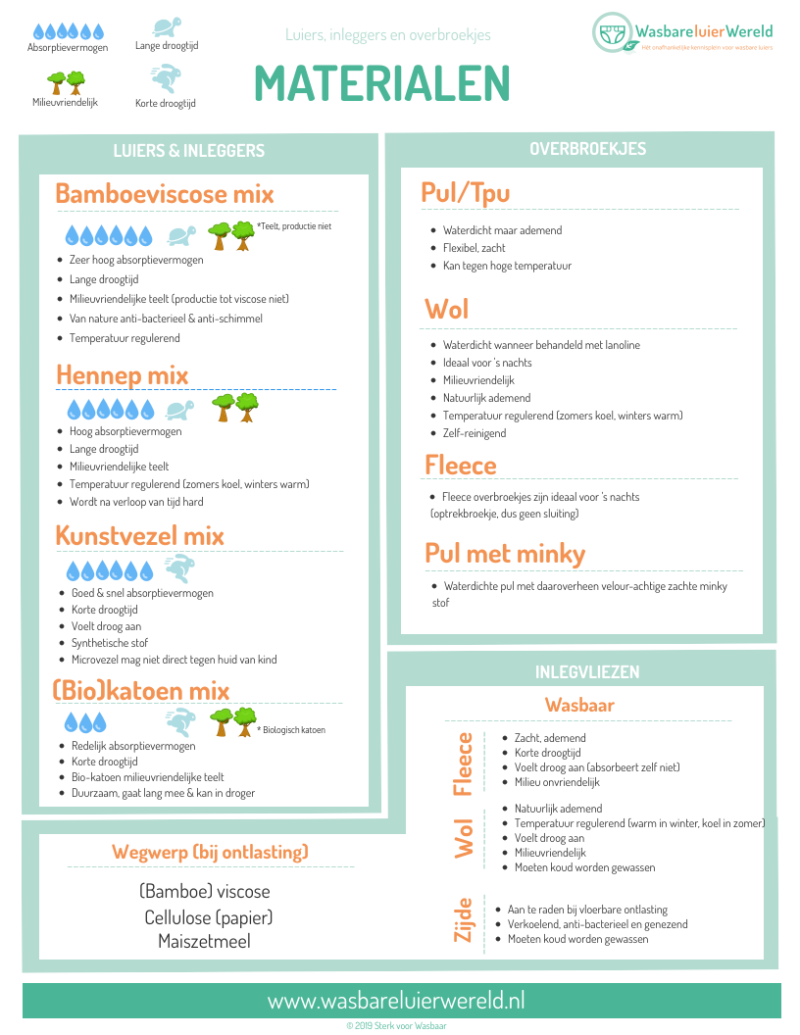 Welke materialen zijn er voor wasbare luiers? Wat zijn de belangrijkste verschillen en wat zijn de voor- en nadelen? Zie hier een helder overzicht van de materialen van wasbare luiers, overbroekjes en inlegvellen. Click op de infographic voor de pdf-versie.